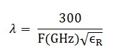 Gdzie λ to długość fali w metrach, F to częstotliwość w GHz, a εr to względna przenikalność elektryczna (epsilon r).