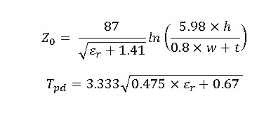 Kalkulator impedancji mikroprzewodnika wykorzystuje następującą formułę do oszacowania impedancji charakterystycznej Z₀ i opóźnienia propagacji TD: