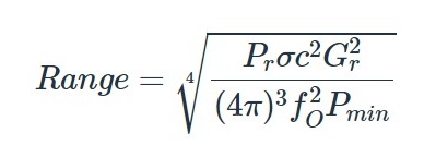 Gdzie R to maksymalny zasięg w metrach, Pt to moc nadawcza radaru, σ to efektywna powierzchnia radarowa celu, c to prędkość światła, G to wzmocnienie anteny, f₀ to częstotliwość pracy, a Pmin to minimalna wykrywalna moc sygnału.